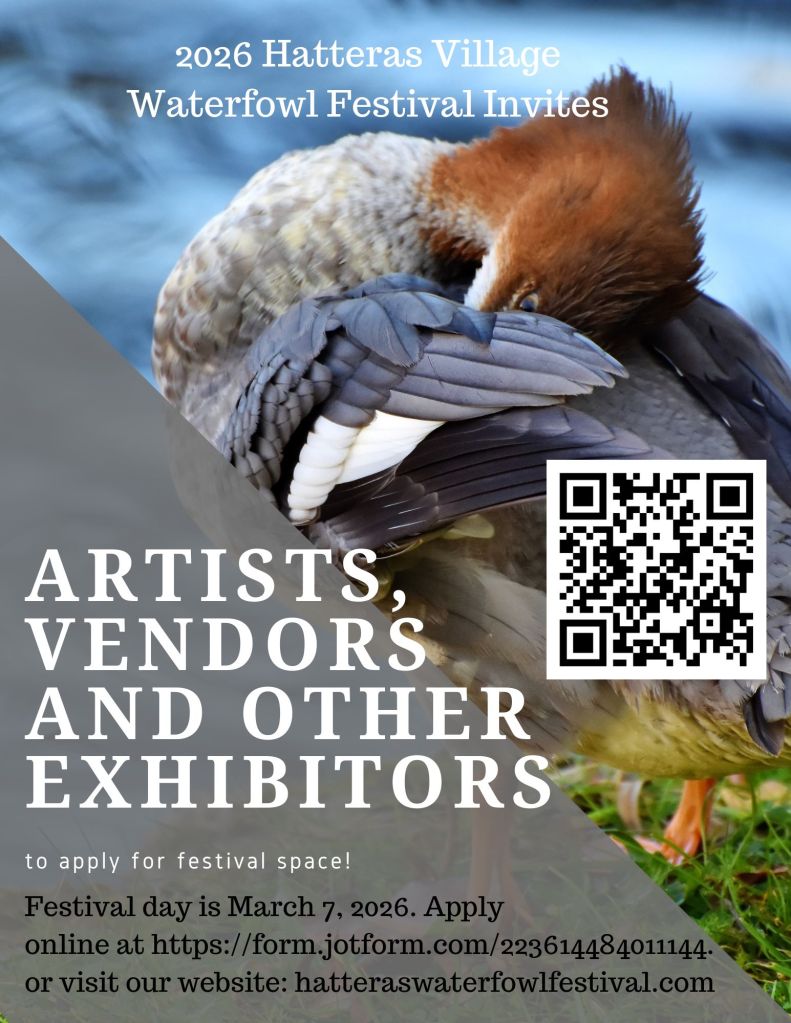 The Hatteras Village Waterfowl Festival will again return for 2026 for our seventh festival with some of our favorite events and vendors as well as some new and exciting additions! This festival, in the beautiful village of Hatteras, celebrates the diverse waterfowl resource native to the island. It begins with an amazing “Fin, Feather and Bourbon” social on Friday evening, featuring small plates and local seafood. Selected bourbons are poured along with a selection of beers and wines that pair with the plates. During the day on Saturday, you will find carvers, artists, vendors and many demonstrations such as a live raptor show, a bird watching tour, a duck call competition and much, much more. All events on Saturday are free and open to the public. Tickets must be purchased for the “Fin, Feather and Bourbon” event are available until we reach our maximum capacity! See our EVENT AND TICKETS page for more information and new events and activities as they are added to the 2026 line up!