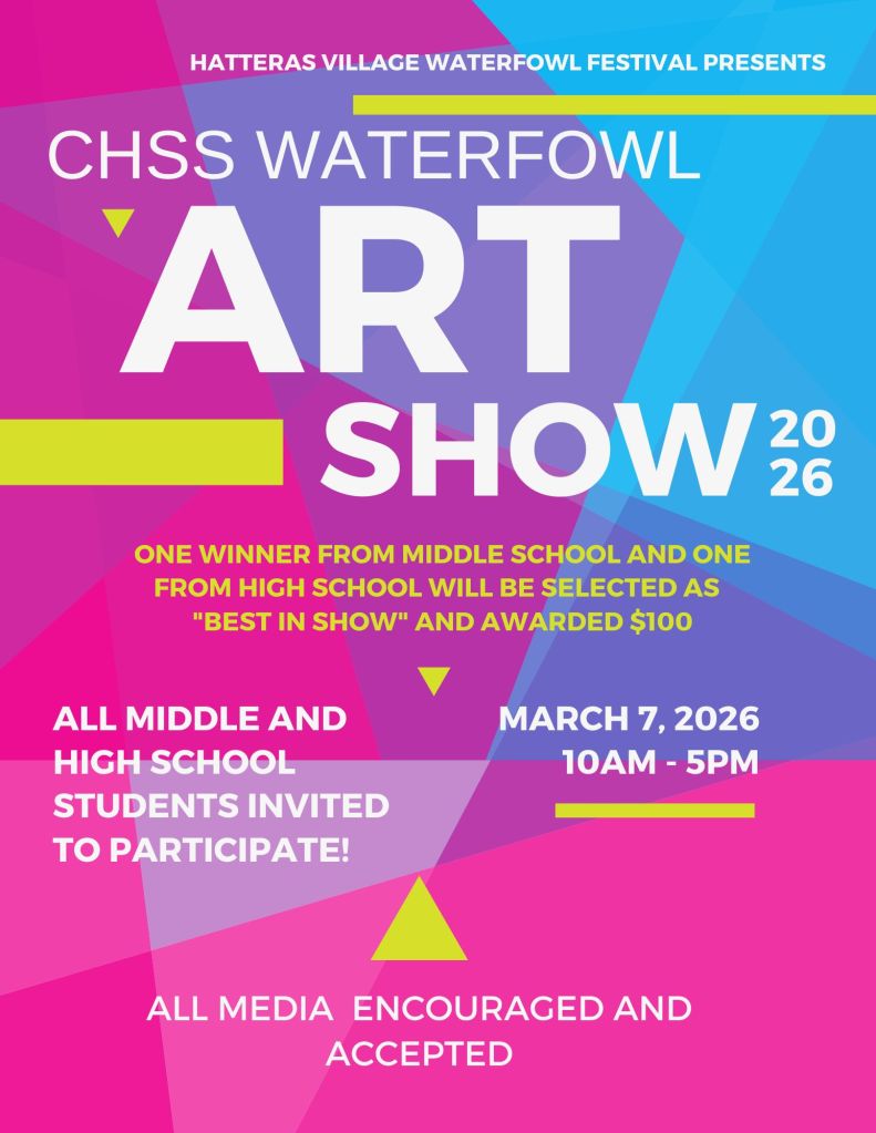 The Duck Calling Competition returns for 2025! Contestants must complete the registered form and submit registration prior to competing. Registration is available until the time the competition begins. Click on image for form. Forms can be submitted to the festival’s email, hatterasevents@yahoo.com, or to the festival information table prior to the competition.